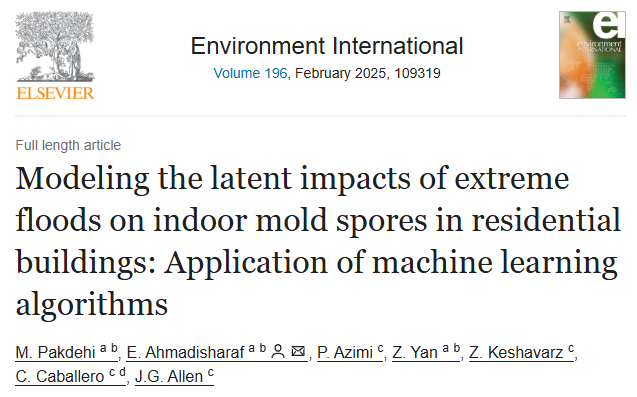 Dr. Parham Azimi, Research Associate on the Healthy Buildings team who led the field assessment efforts, stated, “Flood events cause immense damage, yet the silent threat to indoor air quality remains overlooked. With our comprehensive model, we not only predict the impacts of flooding on mold presence in indoor environments but also illuminate the key factors—like ventilation and flood depth—that can inform mitigation measures.”